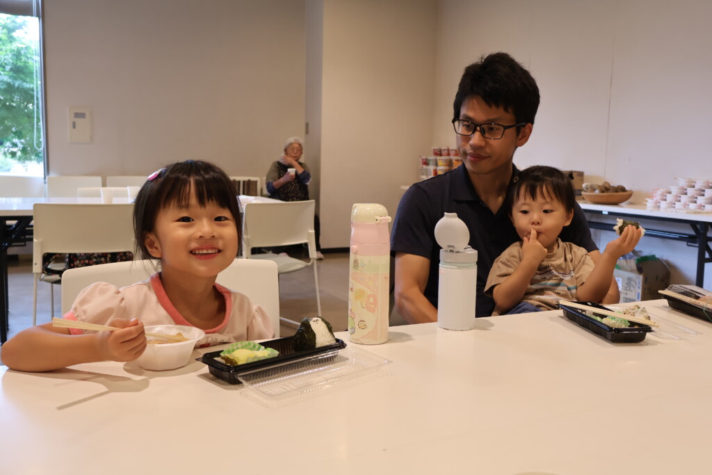 笑顔で食事をする親子(8/30、秋田県大館市で)