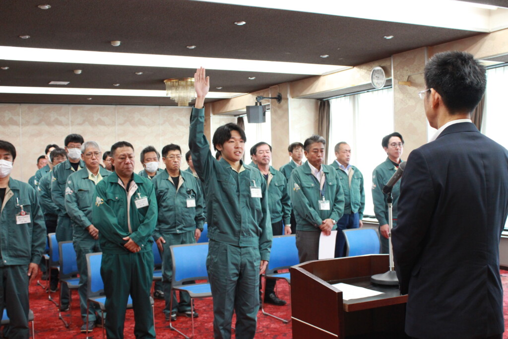 式では、佐藤広美組合長が辞令交付を行い、出席した職員に対し「整理整頓や保管管理の徹底、作業の安全と業務の正確遂行などを常に意識して取り組んでほしい」と訓示。出席した職員らは真剣な面持ちで、責任の重さを再確認しました。