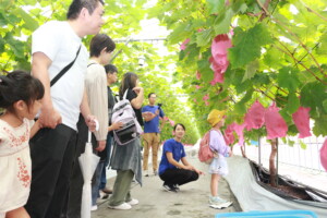 JA研修ハウスでは、「枠板式高畝栽培」を導入したアスパラガスを見学したあと、「盛土式根圏制御栽培」で育てられたシャインマスカットの収穫を体験しました。