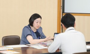 保障提案する木村職員(左)(9/9、秋田県大仙市で)
