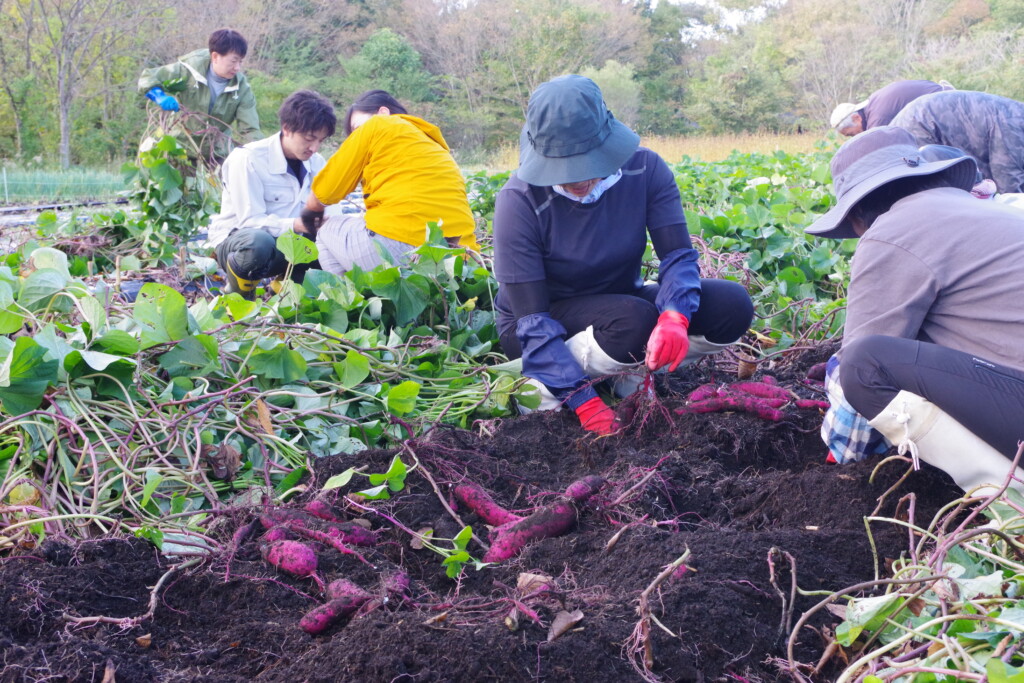 開墾した畑で初めてのサツマイモを収穫する参加者(10/8、秋田県北秋田市にて)