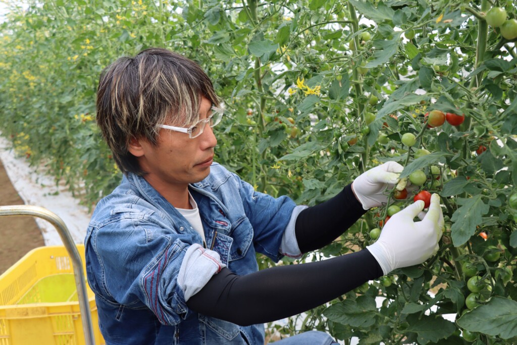 三種町芦崎地区の畠山秀友さん(41)さんは、メロン・水稲栽培が終わったあとのハウス7棟でミニトマト「千果」を栽培。播種(はしゅ)作業は6月から始まり、定植は7月初旬に実施。「芽かきの作業が一番大変」と畠山さんは話します。今年は病害虫対策を徹底したため、良い出来だと笑顔で話しました。収穫は8月下旬から始まっており、今年は、サイズはLサイズが主流とのこと。高温の影響で軟化玉が見られることがあるので、カビが発生しないよう細心の注意を払って出荷しています。