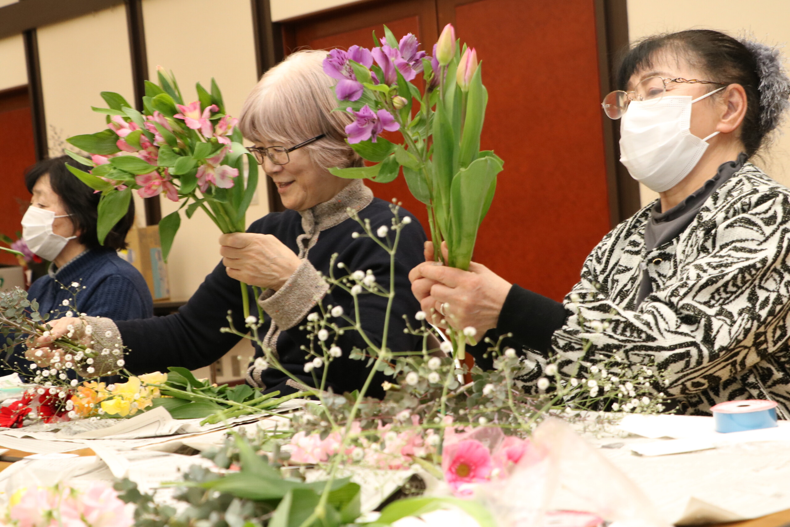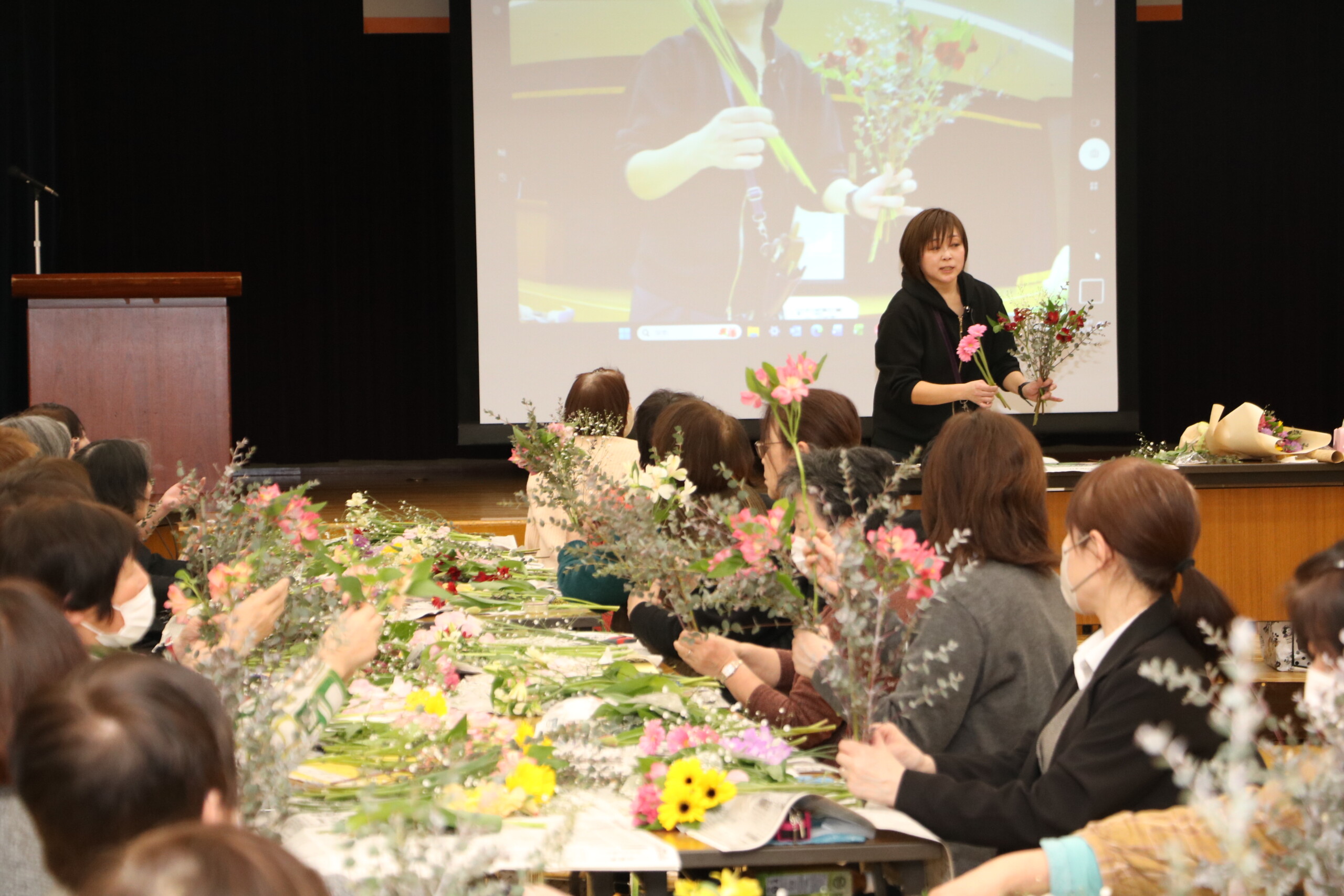 また、秋田県花卉(き)小売商業協同組合の青年部が中心となって県産花きのPRに取り組んでいる「花actあきた」の牧野真美代表ら6名が講師を務め、「小さな花束で季節のお花をおすそ分け」と題してフラワーブーケ講座を実施。牧野代表は「花のある暮らしの楽しさや、県産花きのすばらしさを感じてほしい」と話しました。