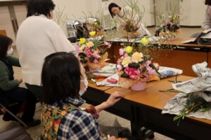 地元の花屋を講師に招き、チューリップやスイートピーなどをあしらった春らしいフラワーアレンジメントに挑戦。部員らは、講師のアドバイスを聞きながら、自分らしく思い思いのアレンジメントを完成させました。